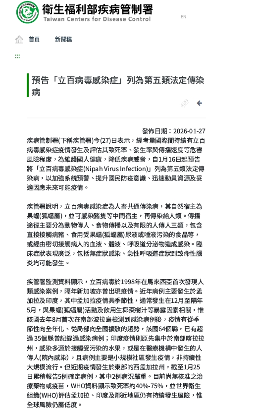 預告「立百病毒感染症」列為第五類法定傳染病 請勿接觸野生動物